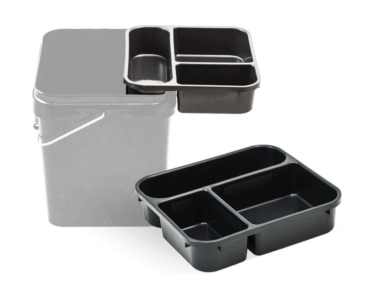 Praktiškas triskyrių įdėklas, skirtas organizuotam priedų, masalų ir jaukų laikymui.